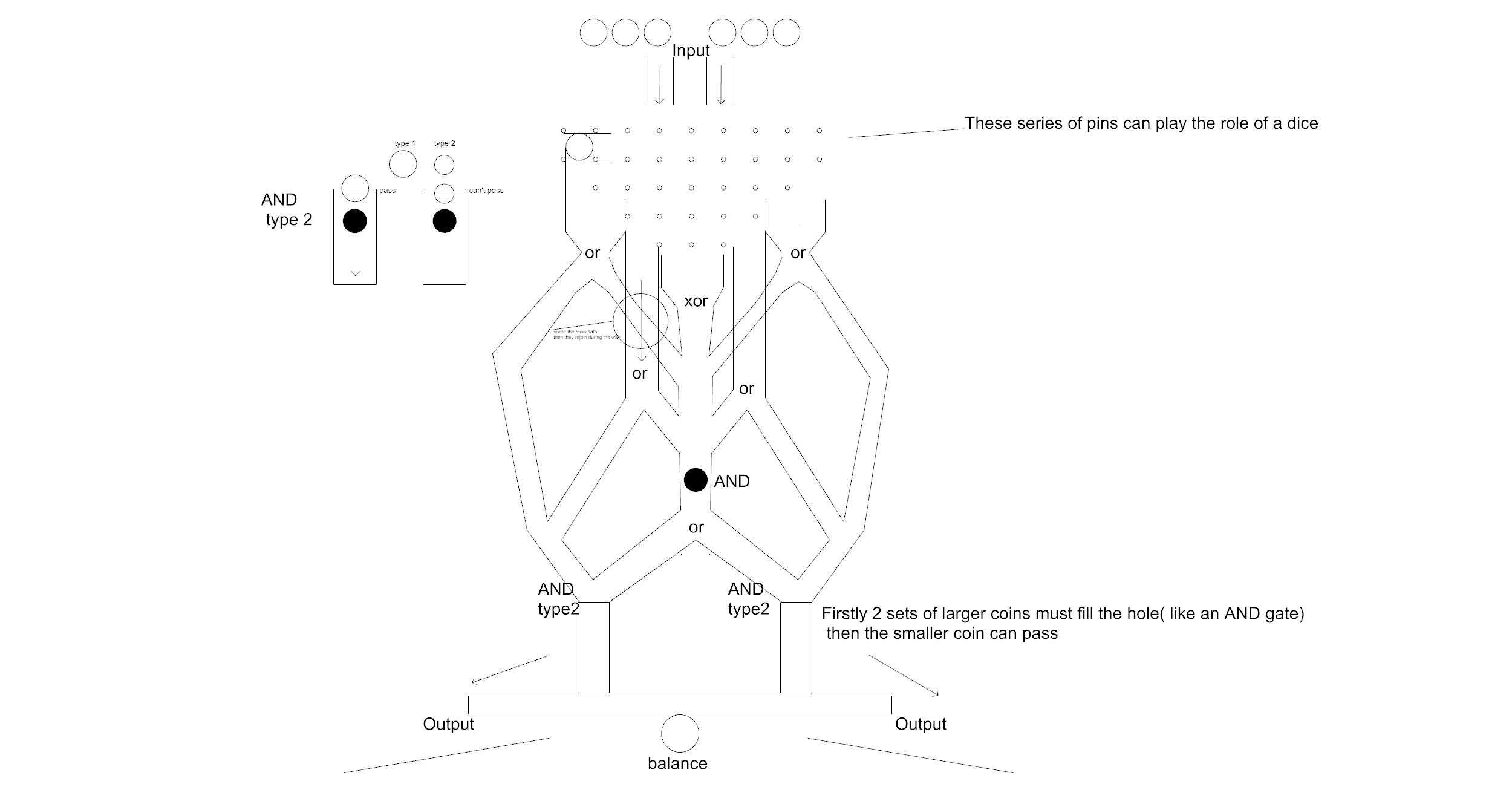 Firstly, each game needs two main parameters to make it worth trying again and again. Random choices and different difficulty levels. At first, series of pins would plate the role of dice in order to push coins in varied paths. then there is a number of OR gates that might end up with a right-hand or left-hand final AND gate. in each of these two final gates, at least two large coins must be filled. Then the final move would be directing a smaller coin toward the AND gate and it will drop on a balanced surface and finally, the reward will be given to the player. However, during this path, it is important to how and when to put large or small coins.